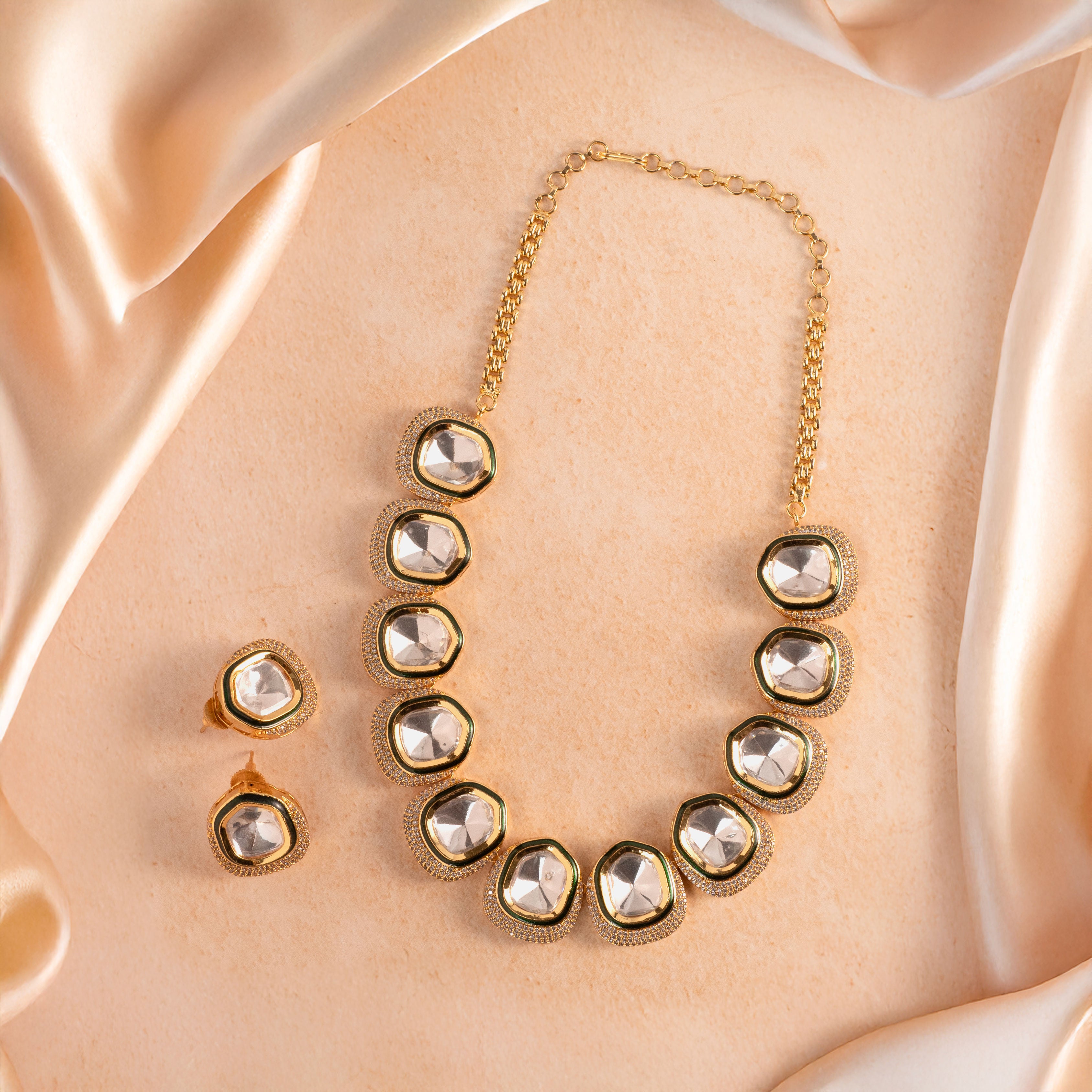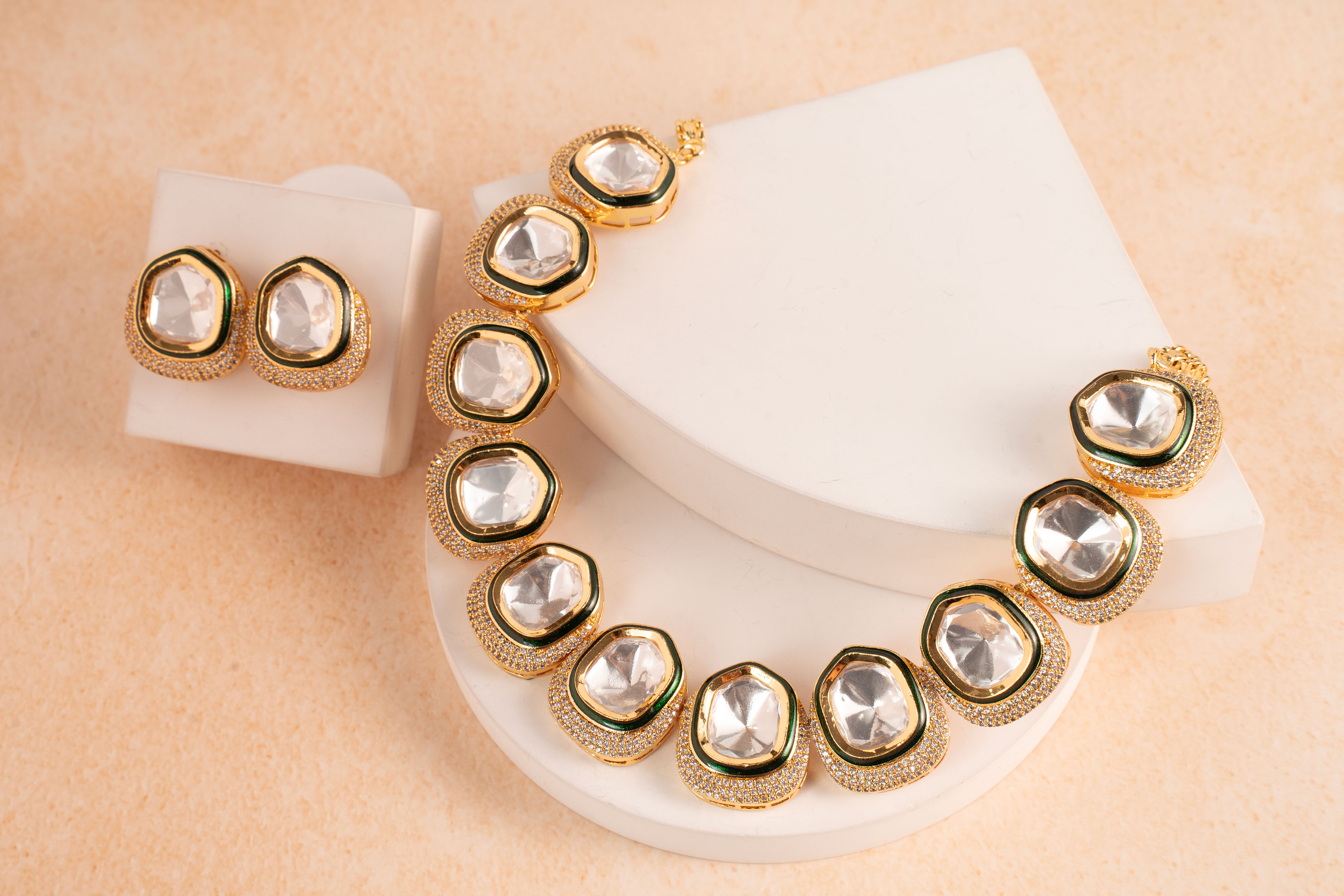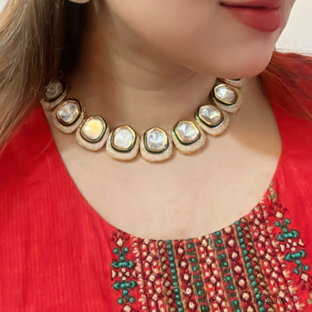 Step into the world of timeless elegance with the Anabiya Kundan AD Set, where tradition meets modern sophistication. This luxurious set features a stunning short necklace, skillfully designed with intricate Polki Kundan stones at its heart, framed by shimmering American Diamonds. Subtle meenakari detailing adds a touch of artistic craftsmanship, making this set truly one-of-a-kind. Paired with matching earrings, it’s the ultimate duo for elevating any outfit.
