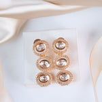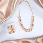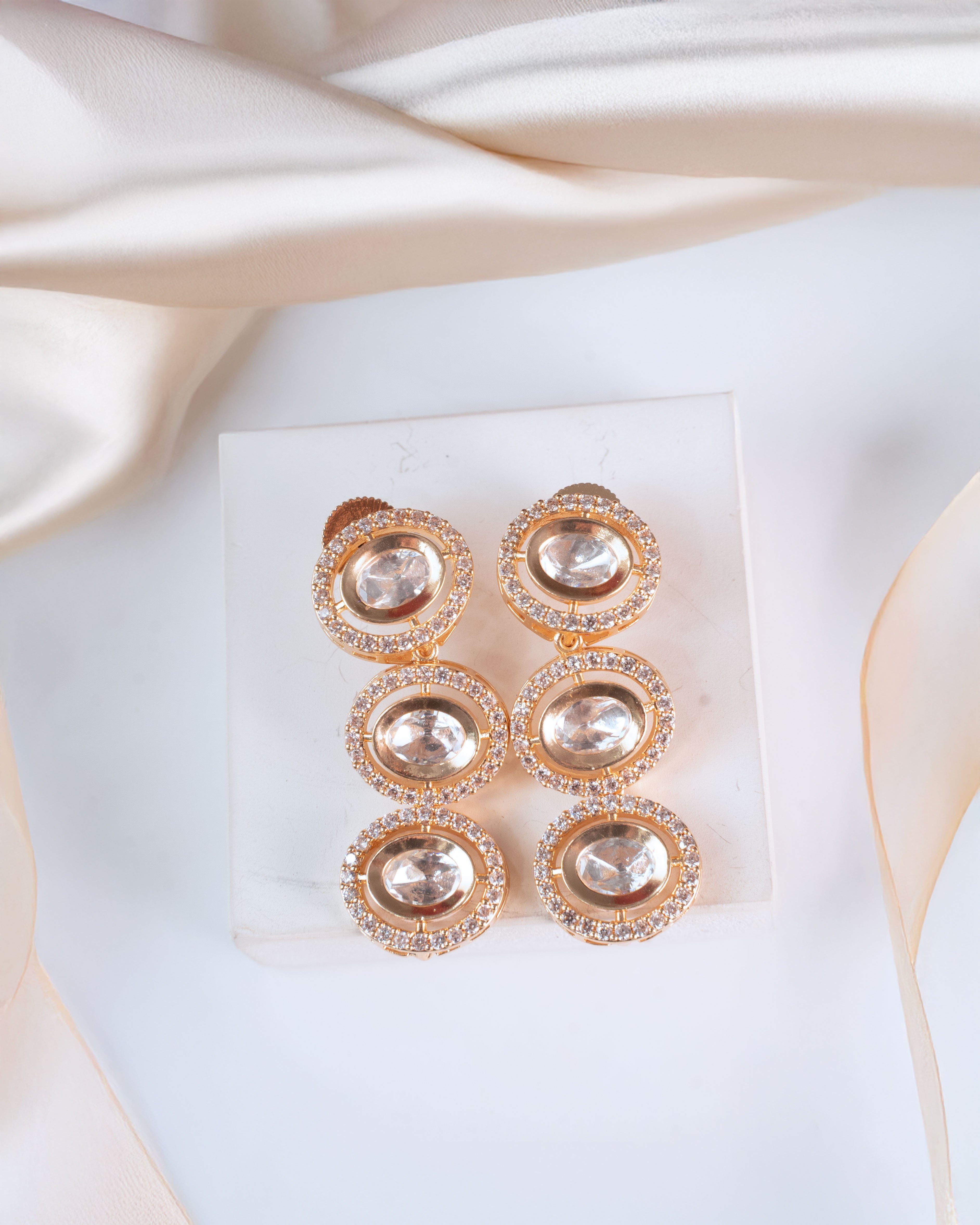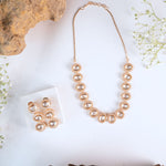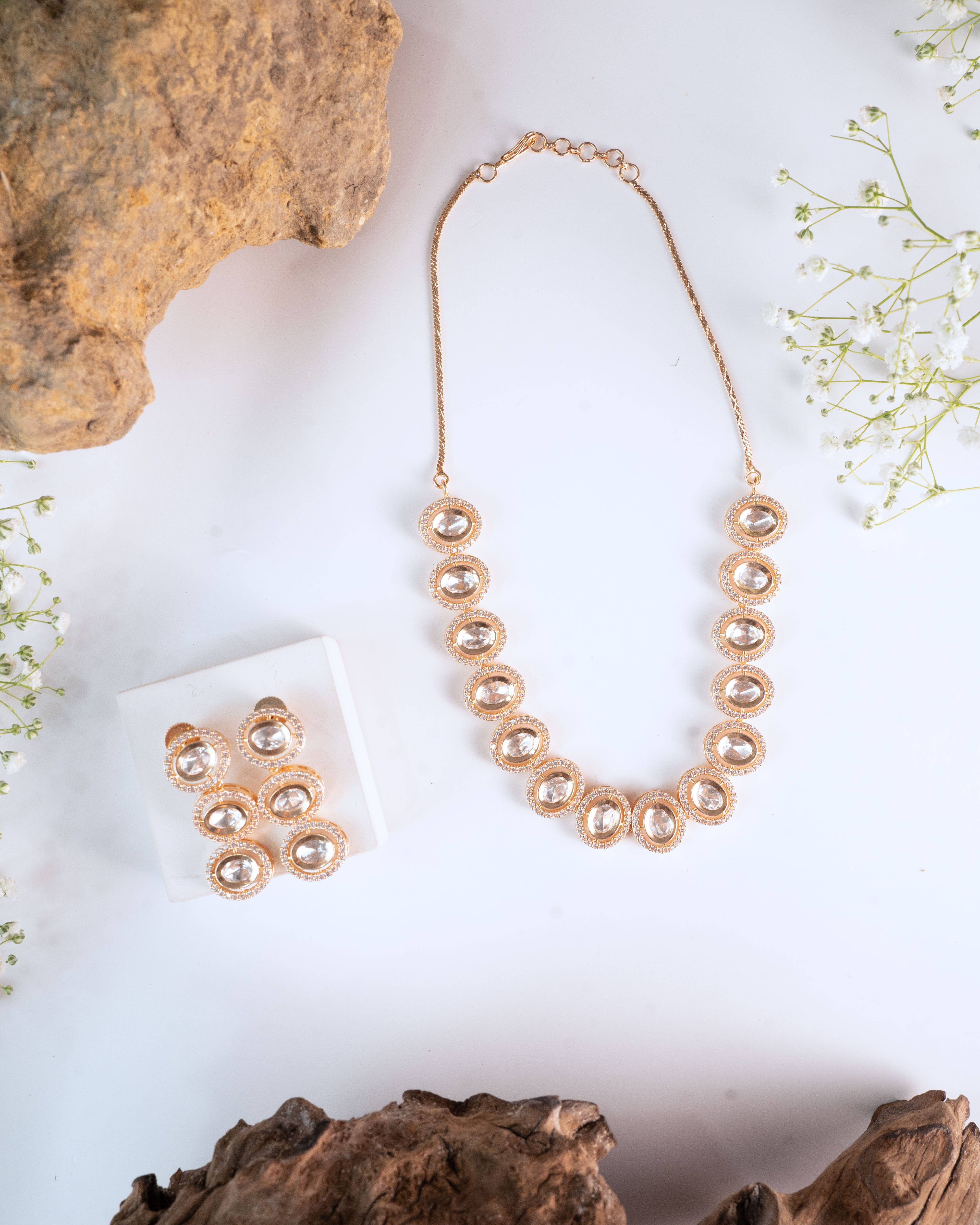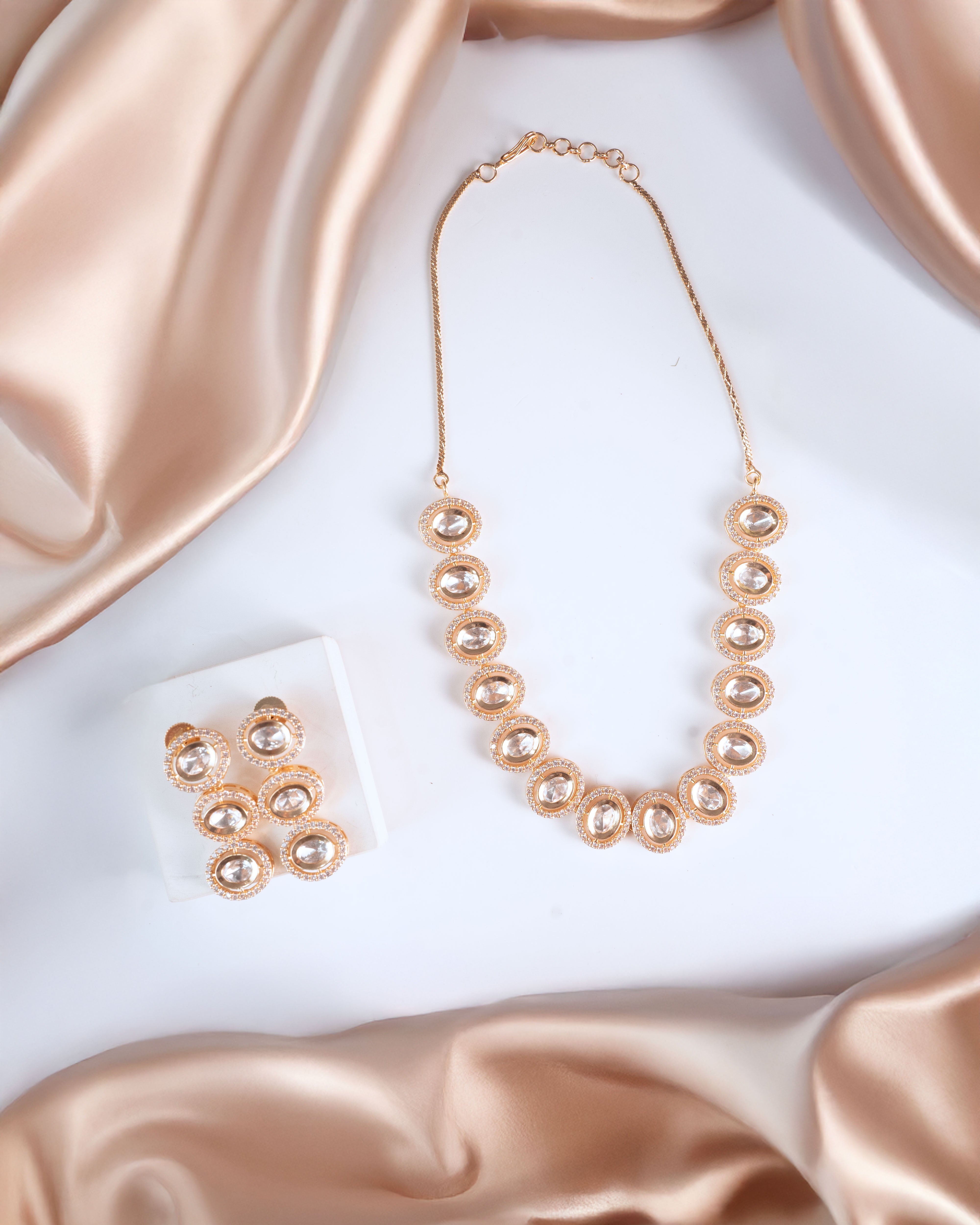 A delicate balance of heritage and modern elegance—this golden-electroplated necklace set is a statement in itself. Featuring classic Kundan stones encased in a halo of shimmering American diamonds, it effortlessly blends tradition with contemporary charm. The soft gold finish adds a warm glow, making it perfect for weddings, festive celebrations, or a touch of luxe in everyday styling.
