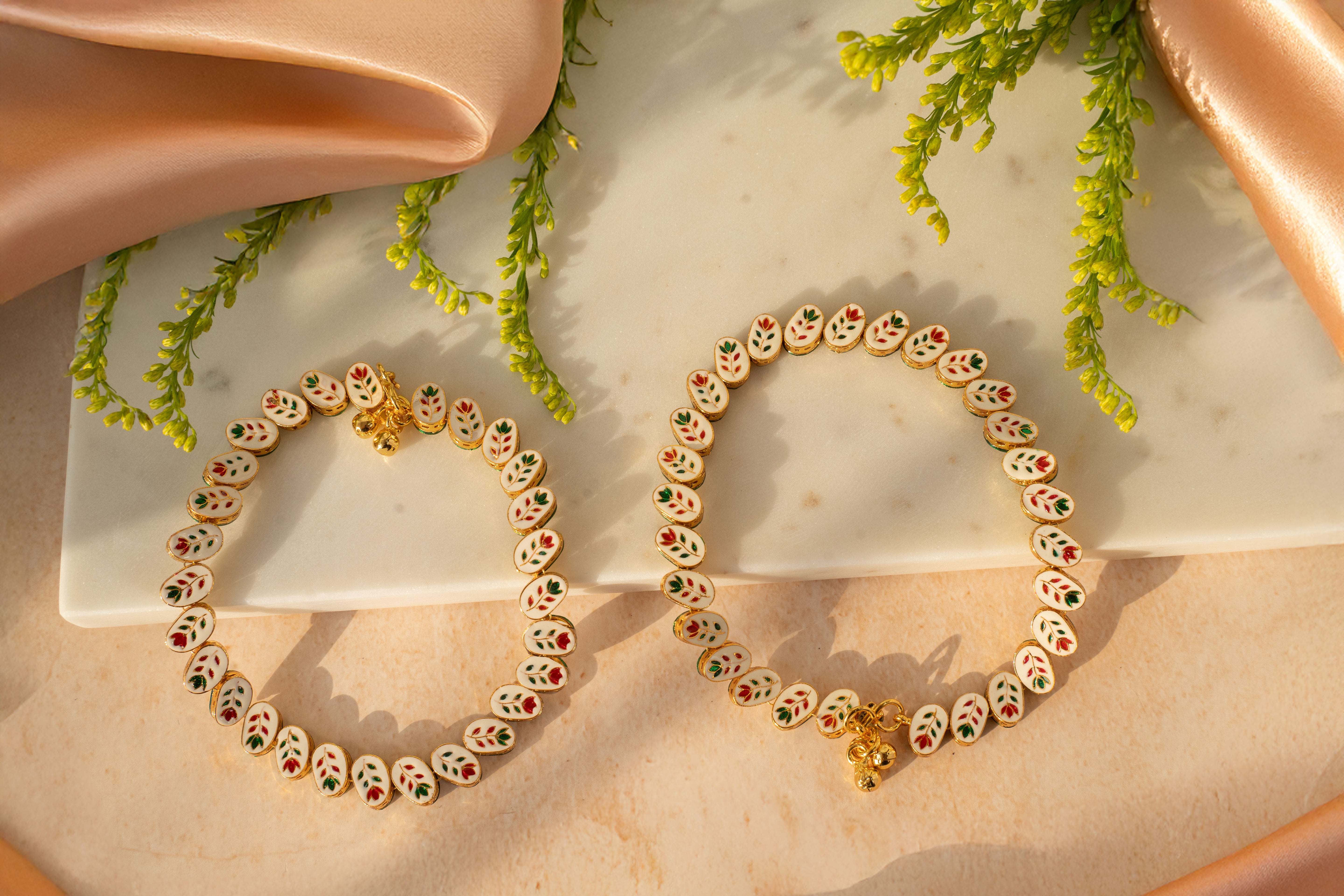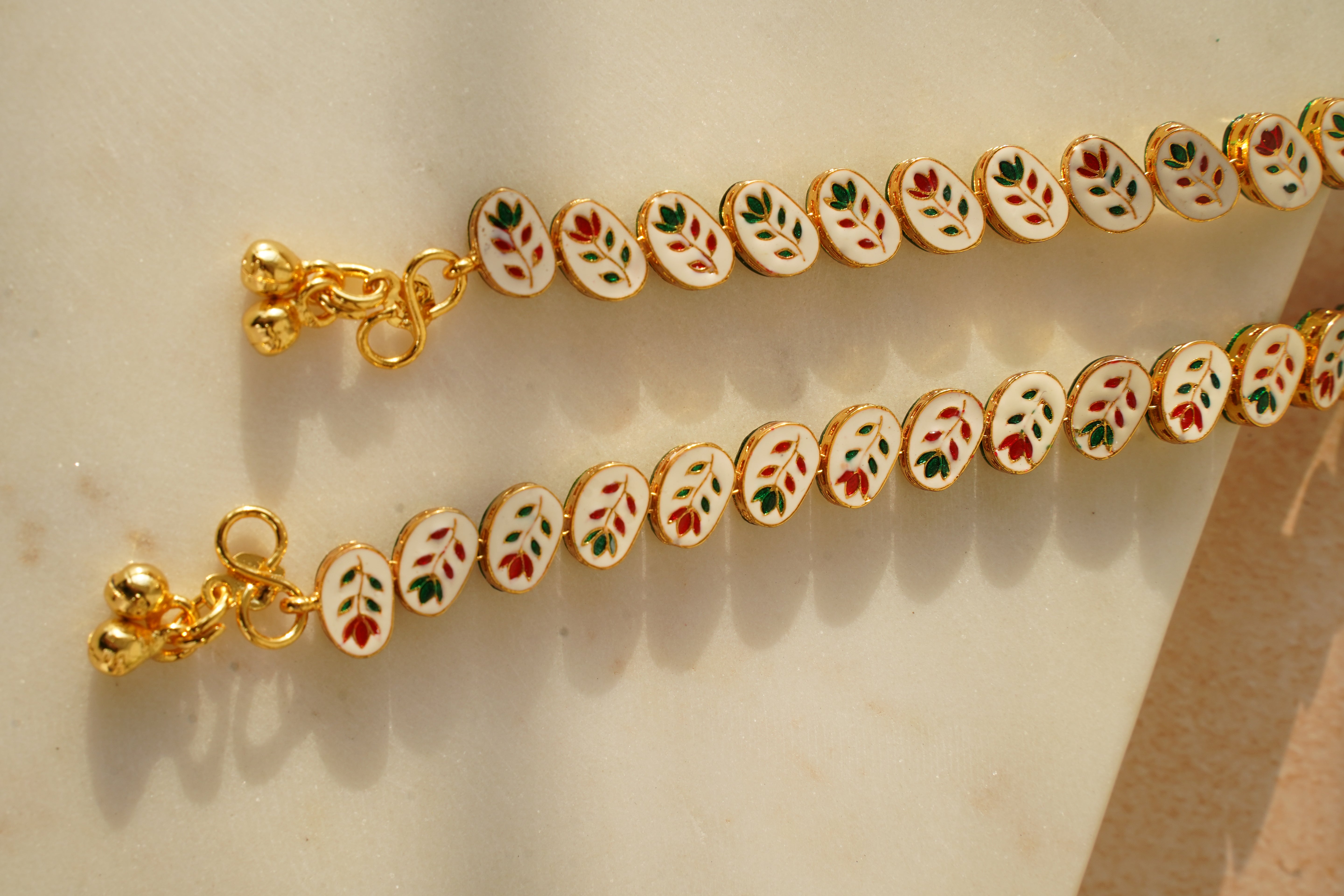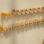 Step into a world of timeless beauty and modern sophistication with our Reversible Kundan Payal Set of 2. Designed for the woman who embraces both heritage and trend, these payals feature stunning Kundan stones set in a luxurious electroplated golden Rhodium finish, adding a touch of opulence to any look. What makes these payals truly special is their reversible design: one side showcases intricate Kundan work with a bold green border, while the other reveals a delicate meenakari enamel design for a soft, romantic feel.