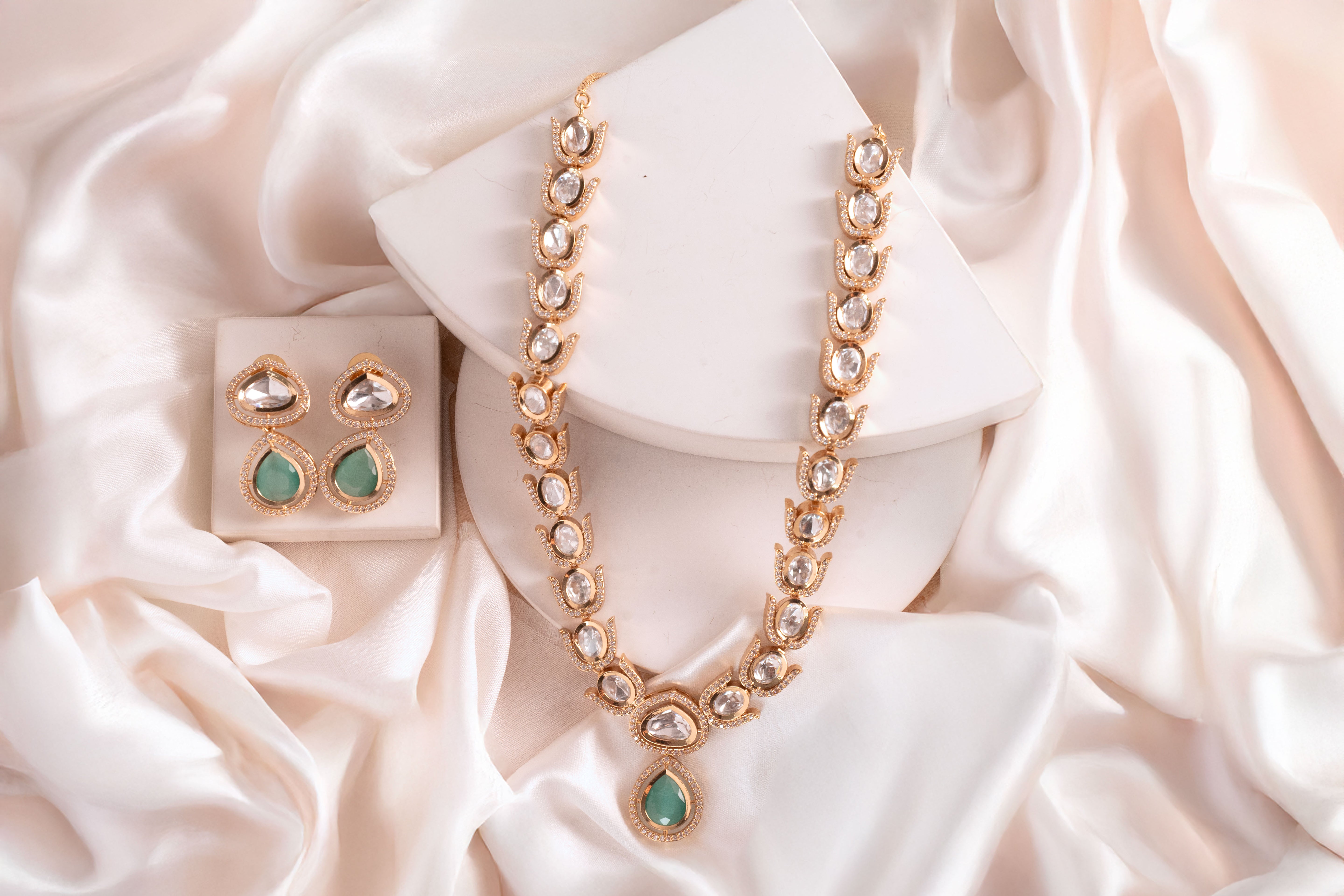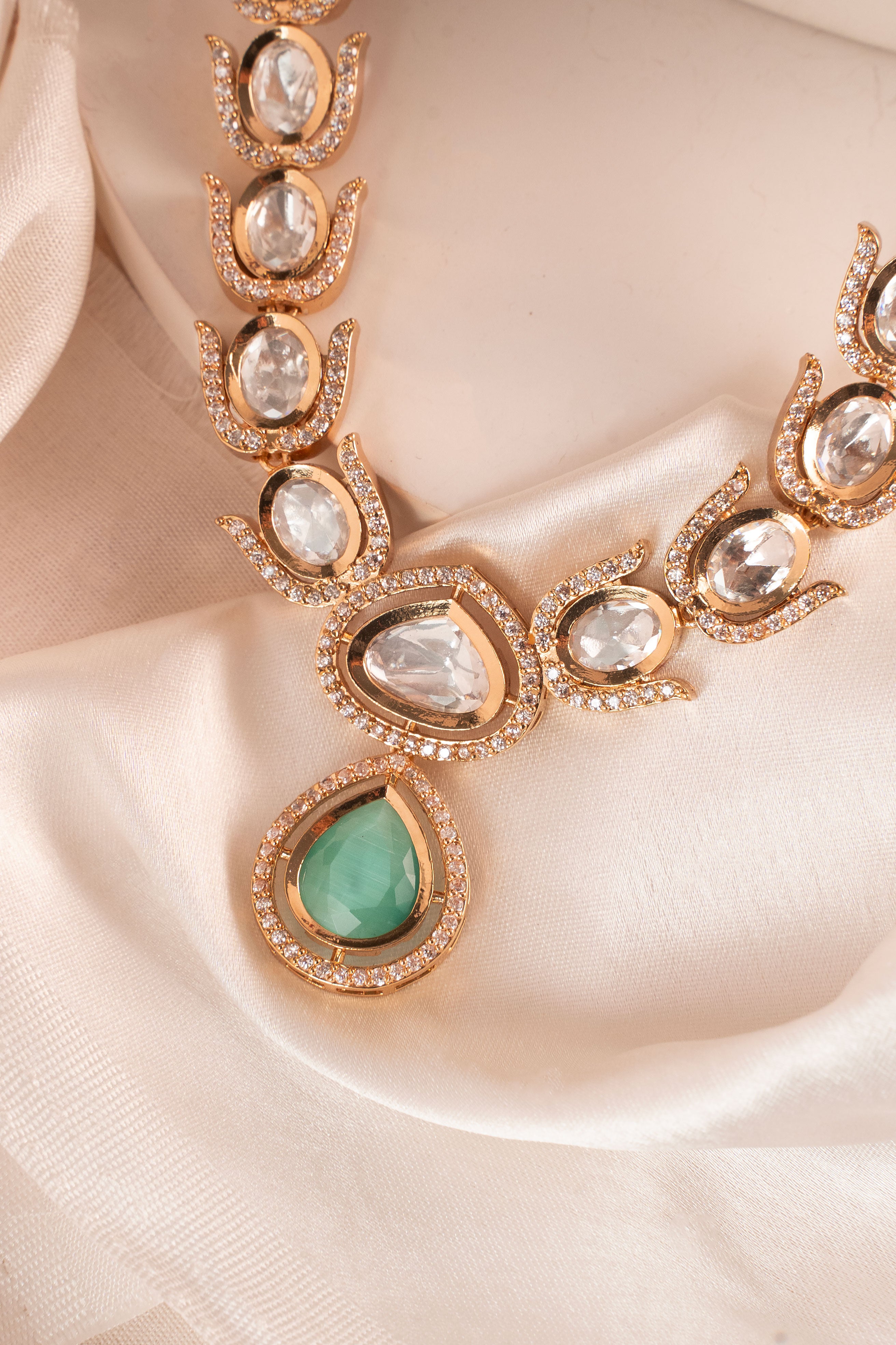 Hand-set Polki stones framed with American Diamonds that reflect light and attention wherever you go. -