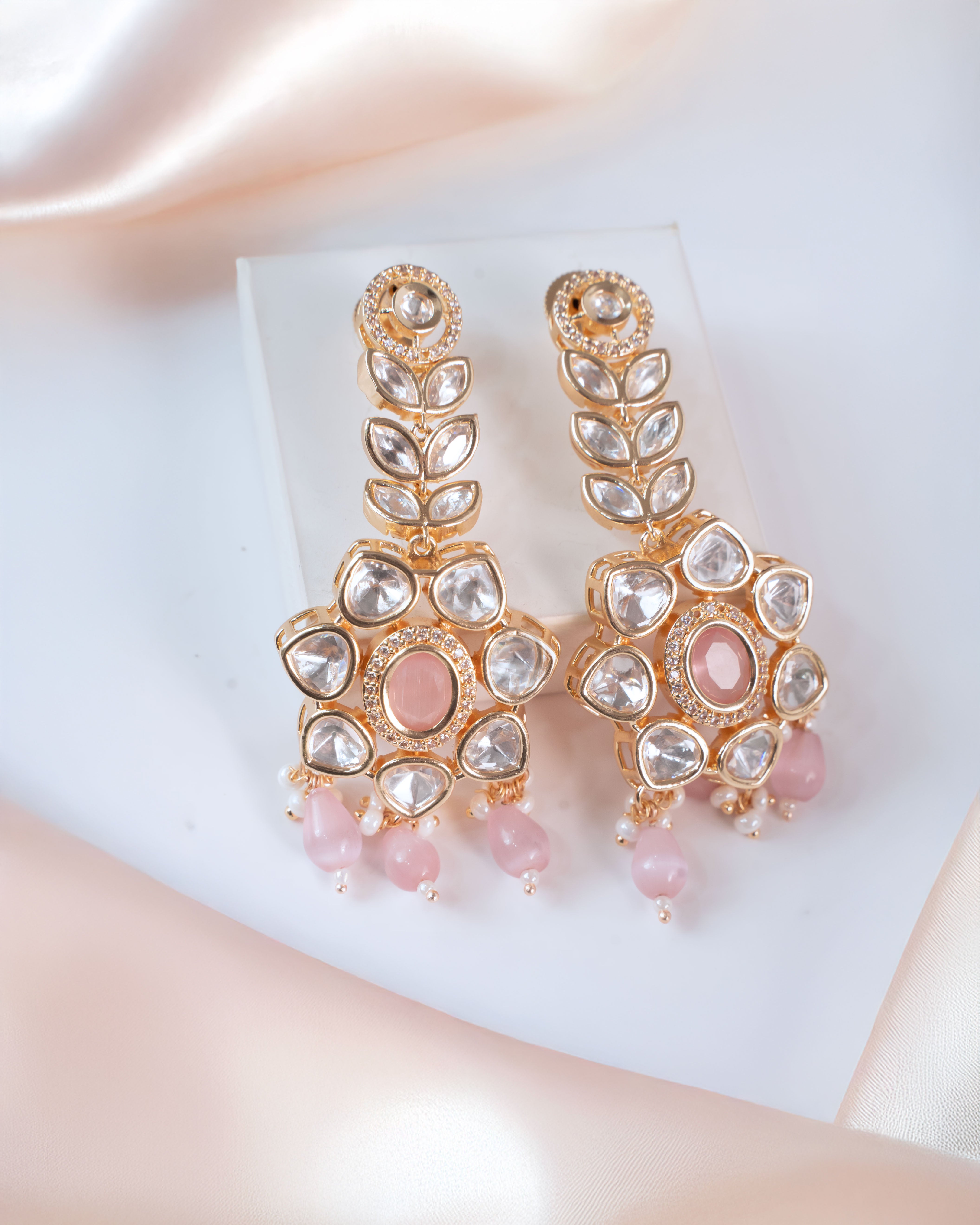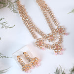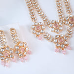 The Maha Kundan Necklace Set is your perfect blend of timeless tradition and soft, modern glam. Thoughtfully handcrafted in brass with golden rhodium plating, this layered beauty speaks volumes—without saying a word.