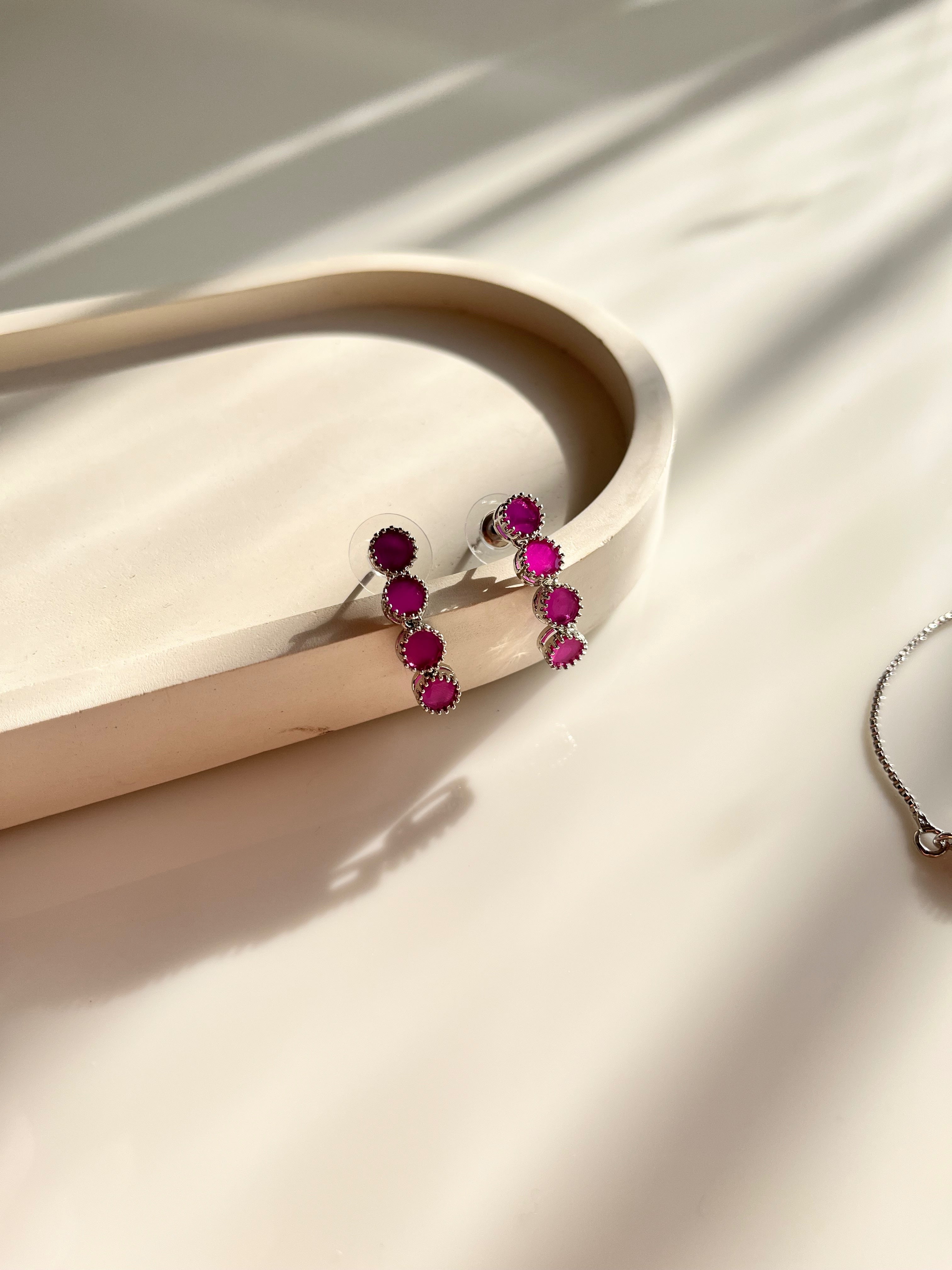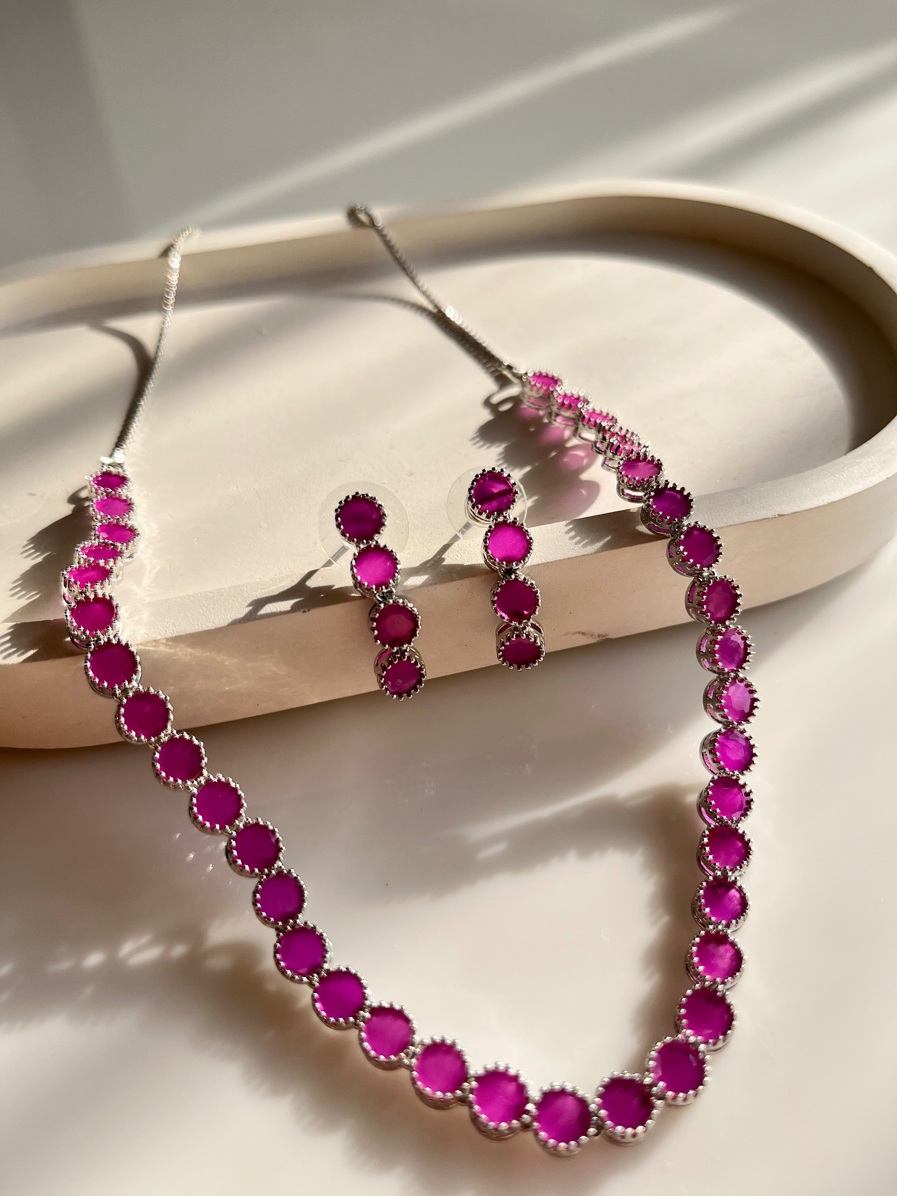 Radiate elegance and grace with the Monica American Diamond Necklace Set—a timeless design that sparkles with sophistication. This exquisite set, available in stunning silver plating with your choice of white, magenta, or emerald green stones, or golden plating with classic white stones, is crafted to bring a touch of brilliance to any outfit.