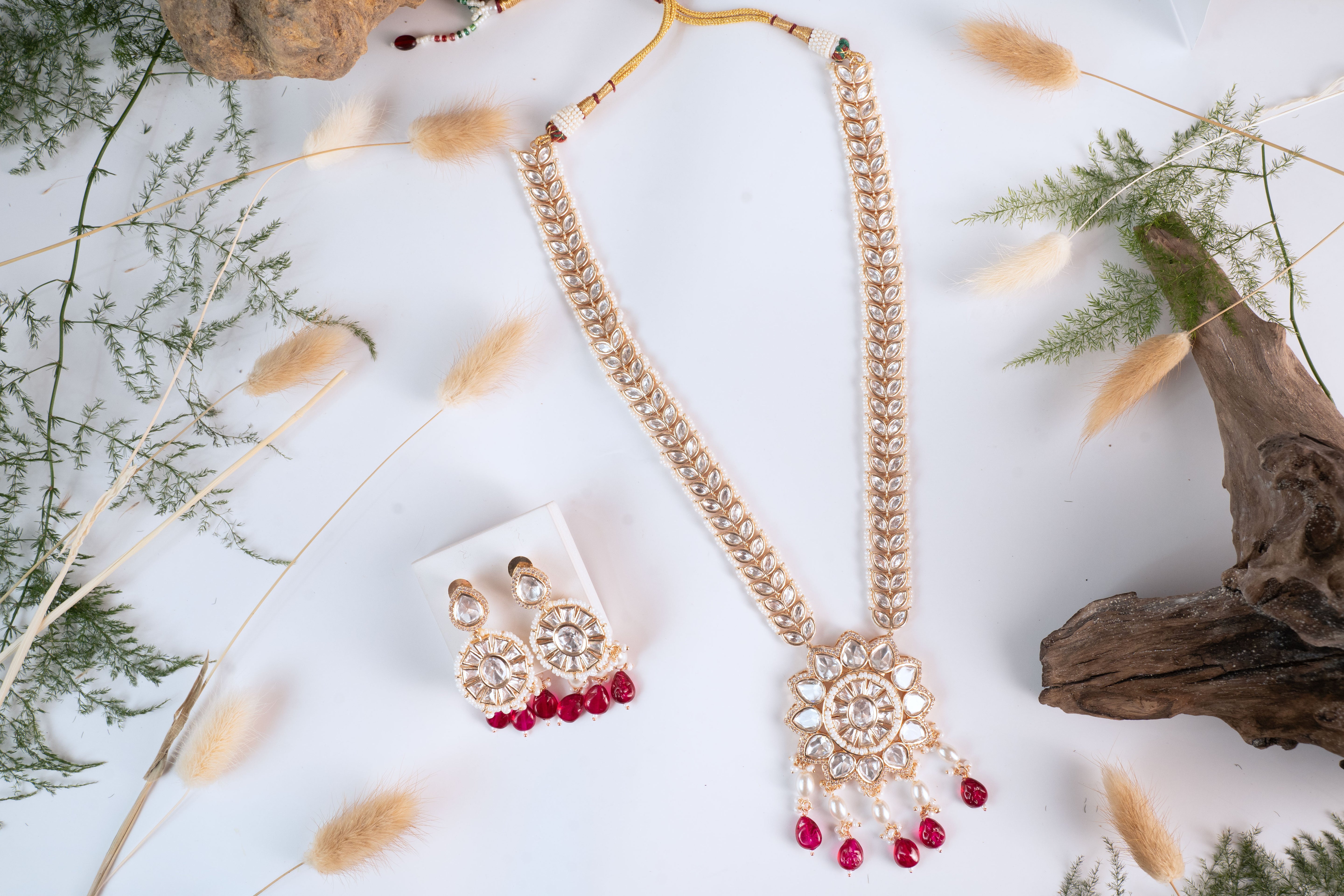 Made from premium brass with golden rhodium plating, this necklace set blends heritage aesthetics with a polished, modern finish. -