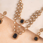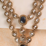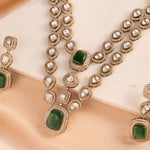 Effortlessly regal, the Rhea Kundan Necklace blends traditional charm with contemporary grace. Designed in an exquisite double-layered silhouette, each Kundan stone is delicately encased with sparkling American diamonds on an oxidized gold base. The Sapphire Blue and Emerald Green hues add a modern twist, making this set a dreamy companion for festive nights and cocktail soirees. Paired with elegant dangler earrings, it's your go-to for making an impact.