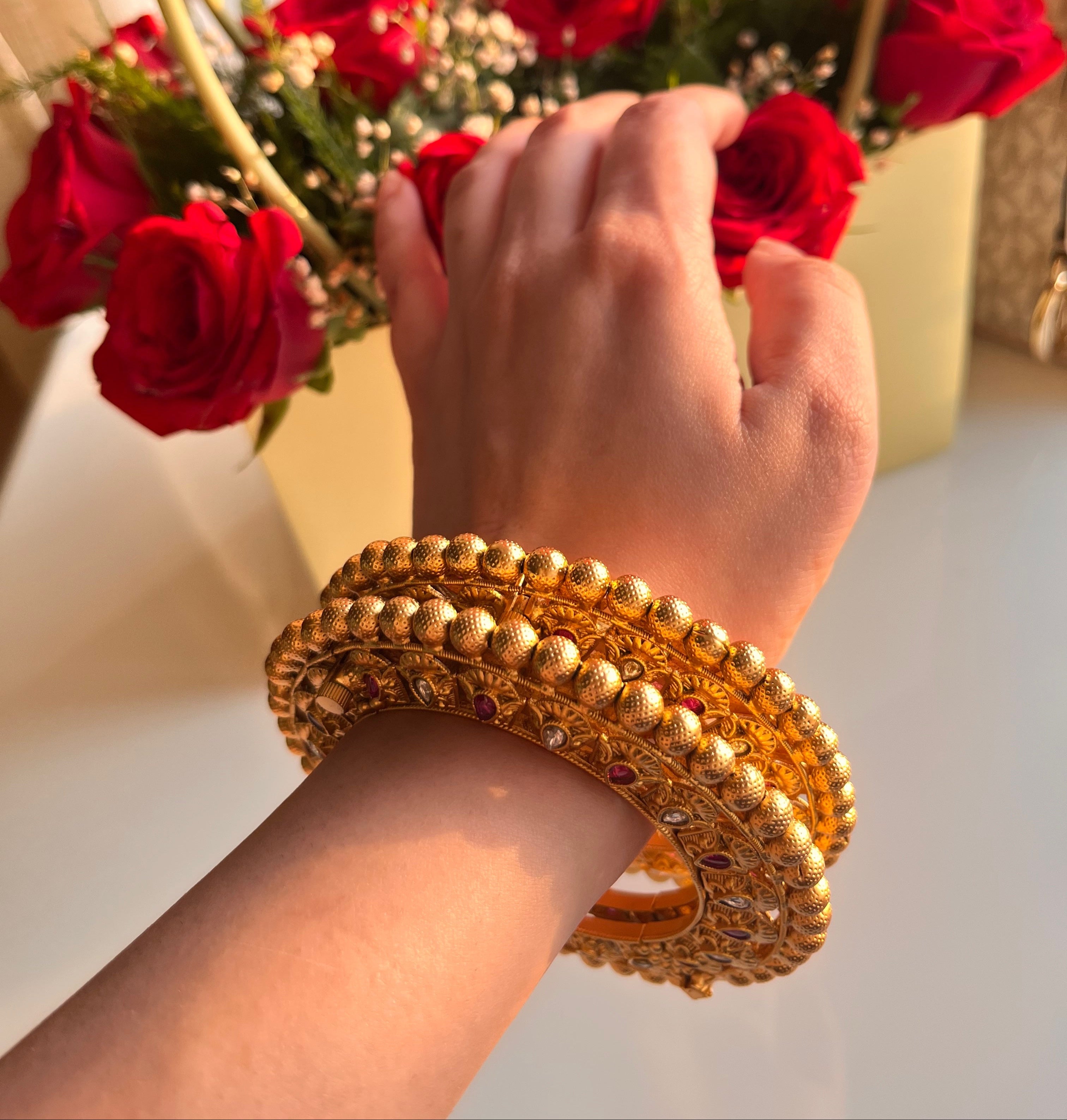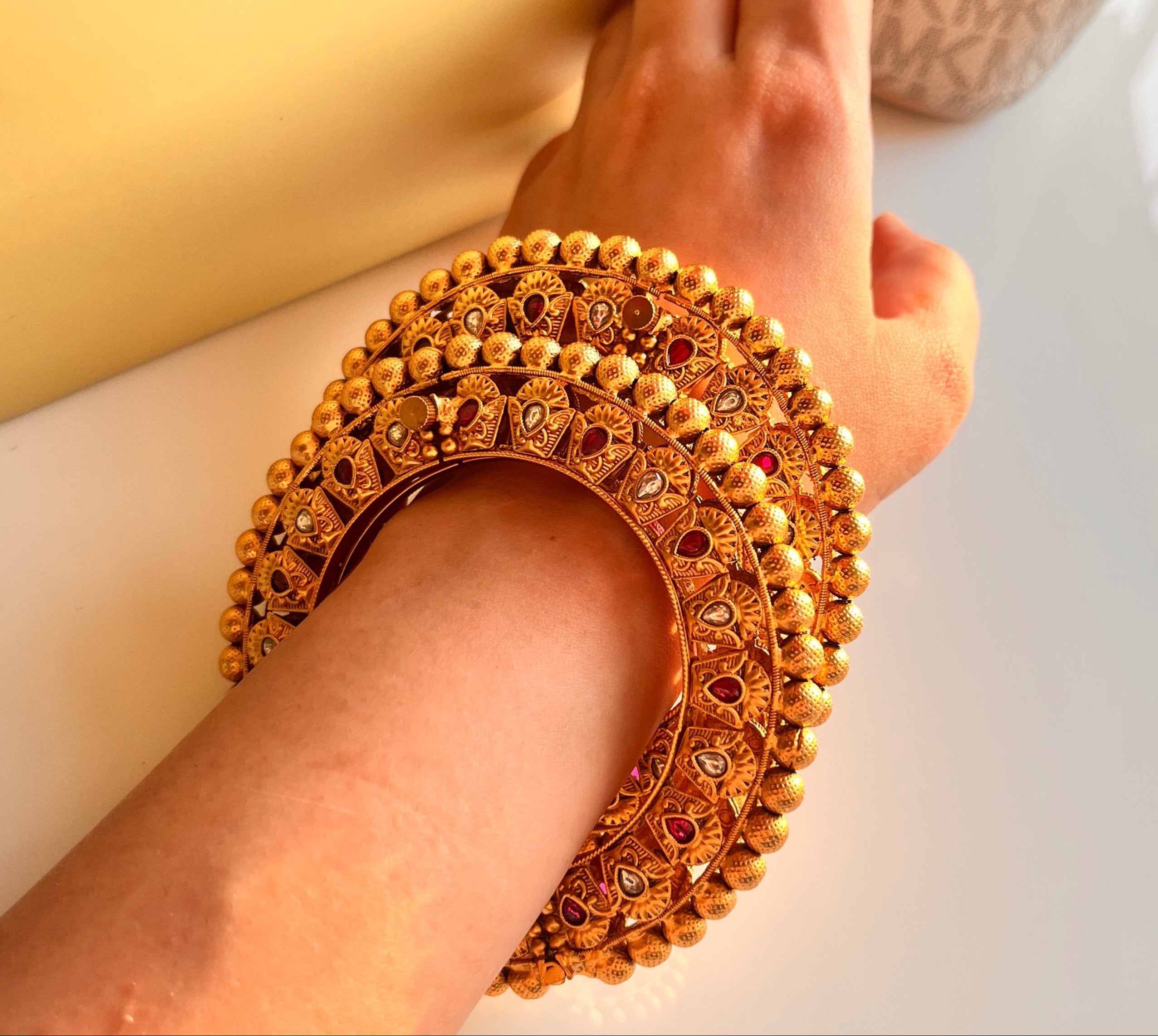 Step into elegance with our Safa Golden Kangan – a graceful blend of traditional artistry and modern flair. Designed for the modern Indian woman who adores heritage with a hint of edge, these circular temple-style bangles feature exquisite red enamel work nestled in a high-polish antique gold finish.