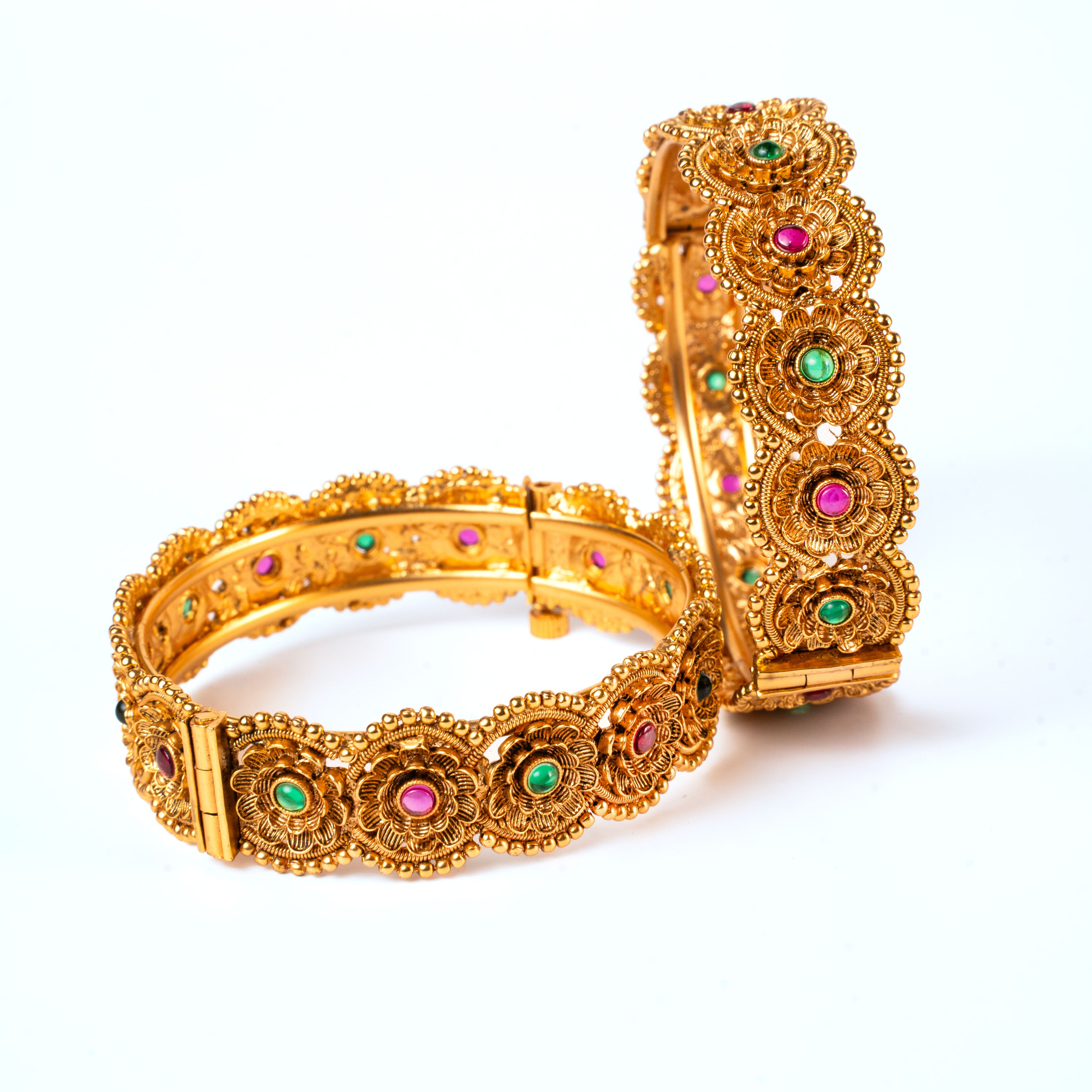 Add a floral flourish to your jewelry box with our Sahira Golden Kangan—a contemporary ode to nature’s elegance. Intricately handcrafted with blooming floral motifs and adorned with dual-tone stones in magenta and green, this set brings a refreshing twist to temple-style classics.
