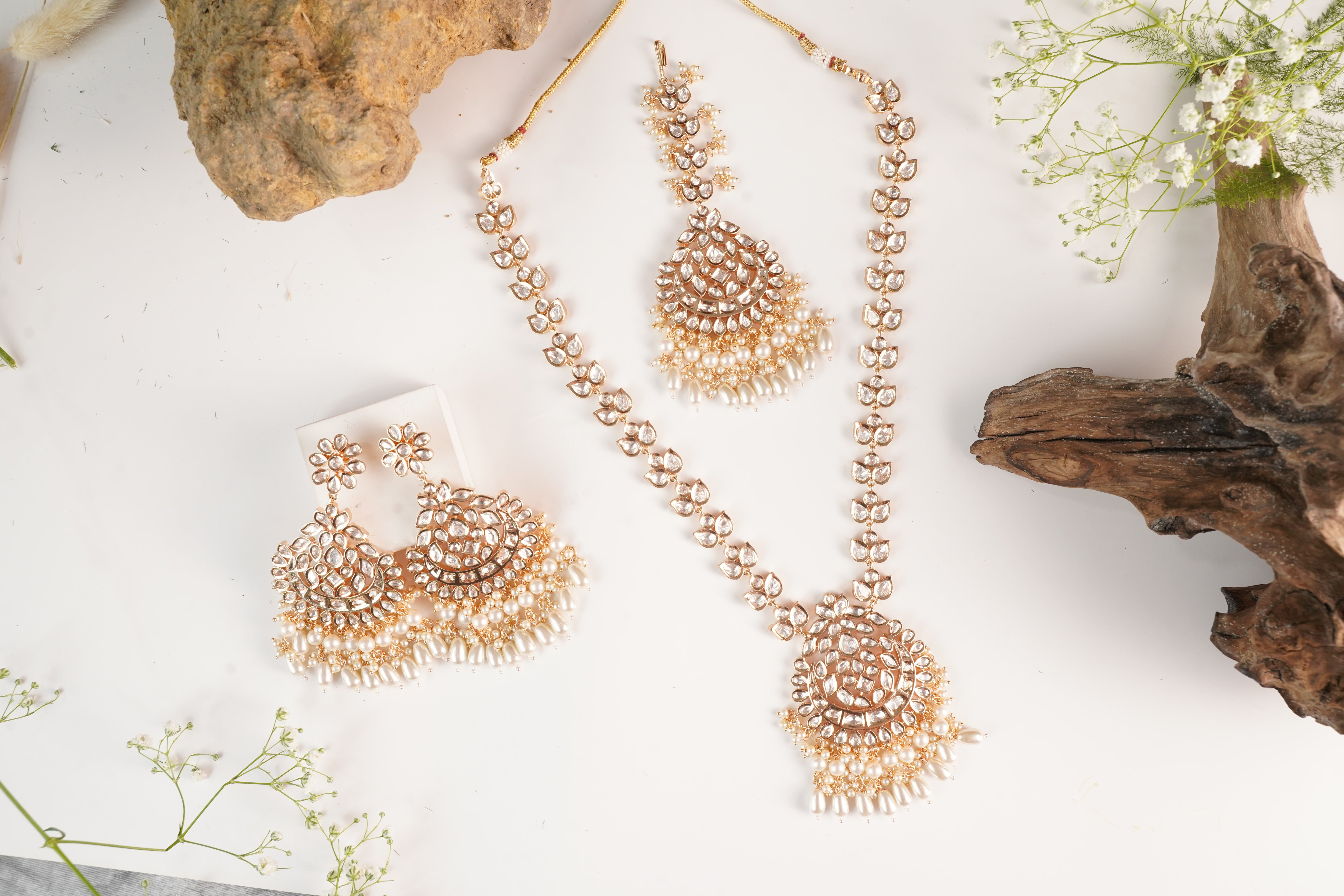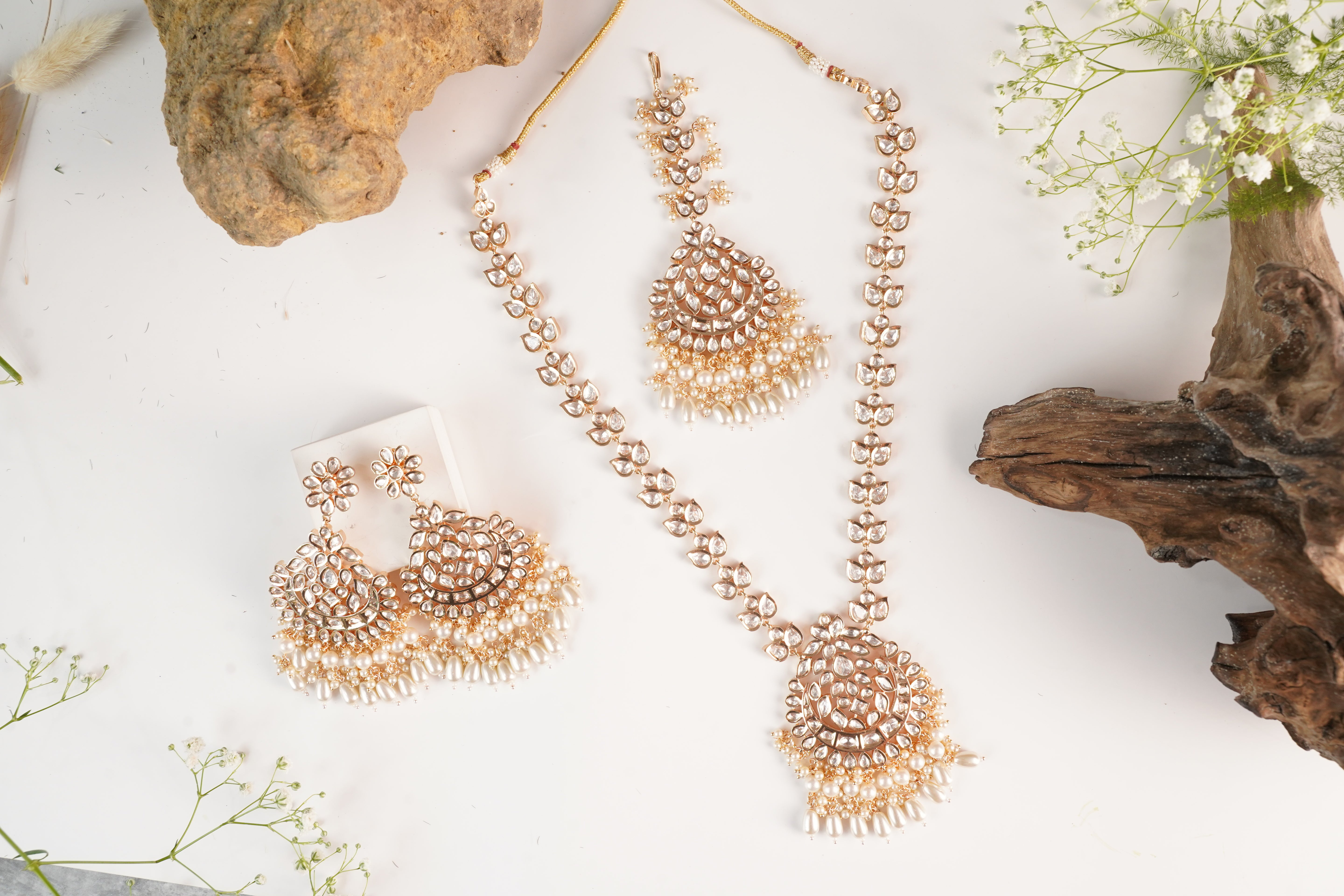 Intricately designed earrings to complete the set, giving you a picture-perfect finish.
