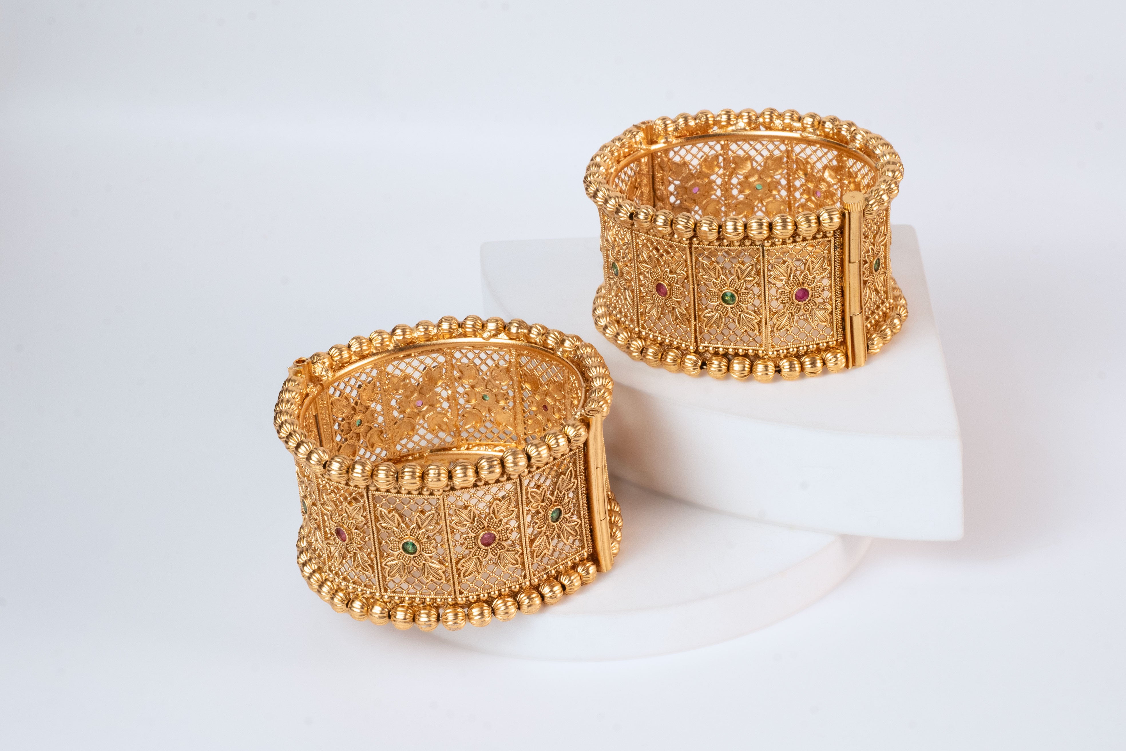Elevate your elegance with the timeless charm of the Suraiya Golden Kundan Kangan. This set of two bangles beautifully showcases a delicate netted floral design, enhanced with intricate details and a luxurious golden rhodium finish. The subtle pops of vibrant green and ruby Kundan accents add a lively touch to this graceful design, making it the perfect blend of tradition and sophistication.